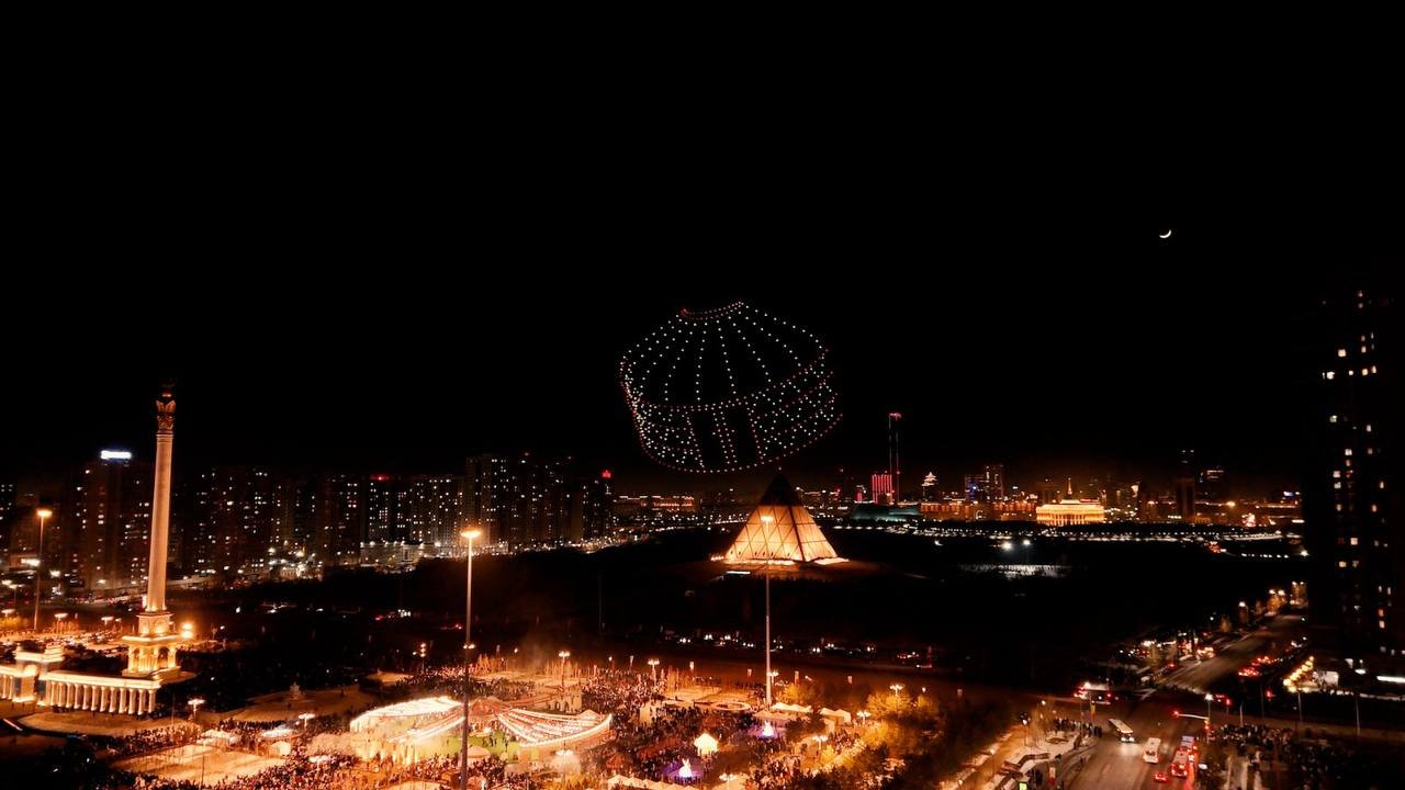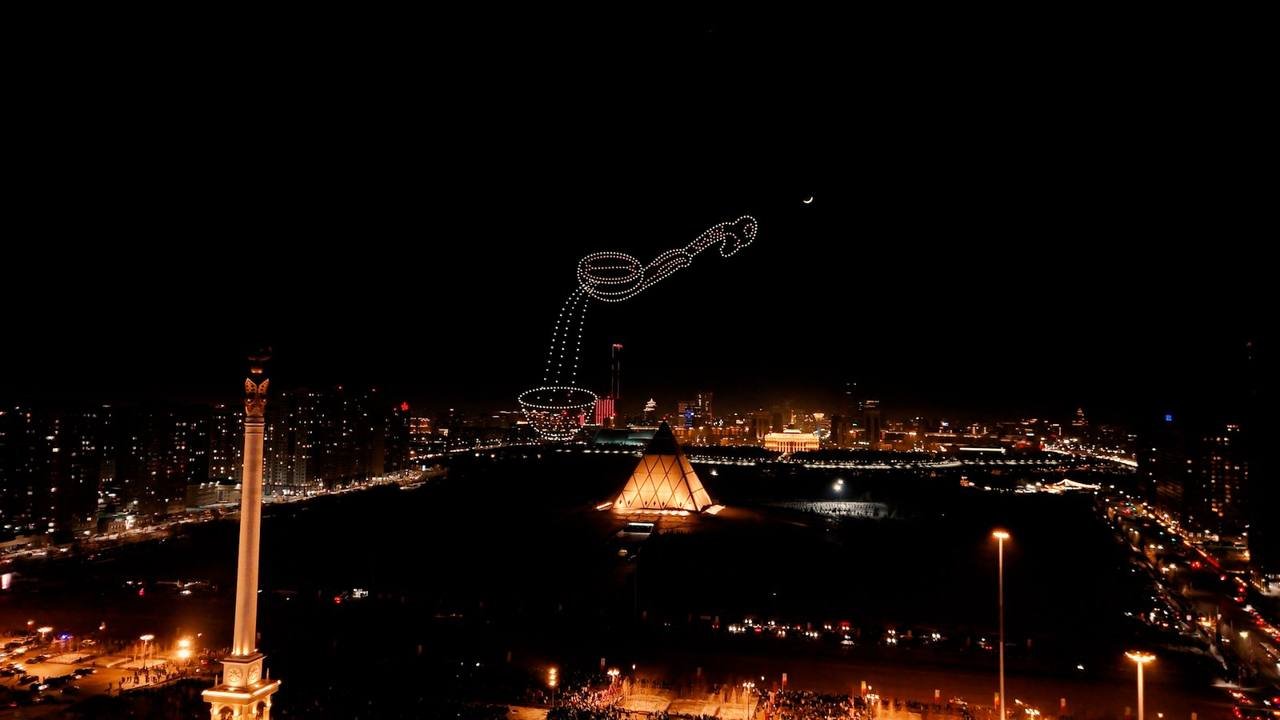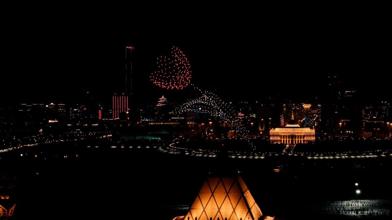 В Астане в честь праздника устроили масштабное дрон-шоу, превратившее ночное небо в яркую световую сцену.