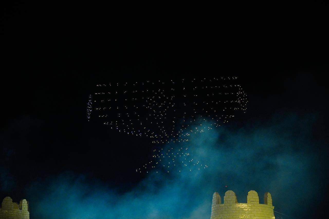 В небе появились юрта, тайказан, чаша с шубатом, караван с верблюдом и асык — символы кочевого наследия, достатка и самобытности народа.